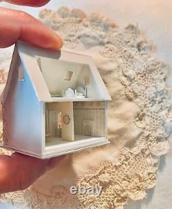 This beautiful miniature dolls house is entirely handmade and painted in a soft grey colour. It has an old feel to it and is a lovely a accessory for inside a shabby chic or aged dolls house. Fully detailed with furniture miniature wallpaper and tiny hand painted flowers on both sides.